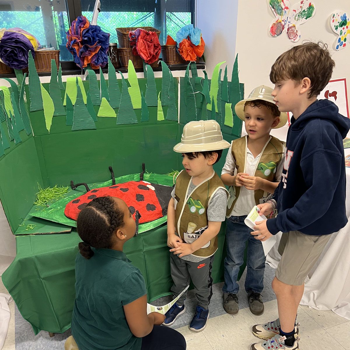 In 2022-23, Nursery 3 students chose to focus on insects. In June, they shared the culmination of their studies, their classroom outside garden. They created a butterfly, a ladybug, and an ant. They also made books about each insect. Parents, their 4th grade buddies, faculty and staff enjoyed seeing the results of their hard work!
